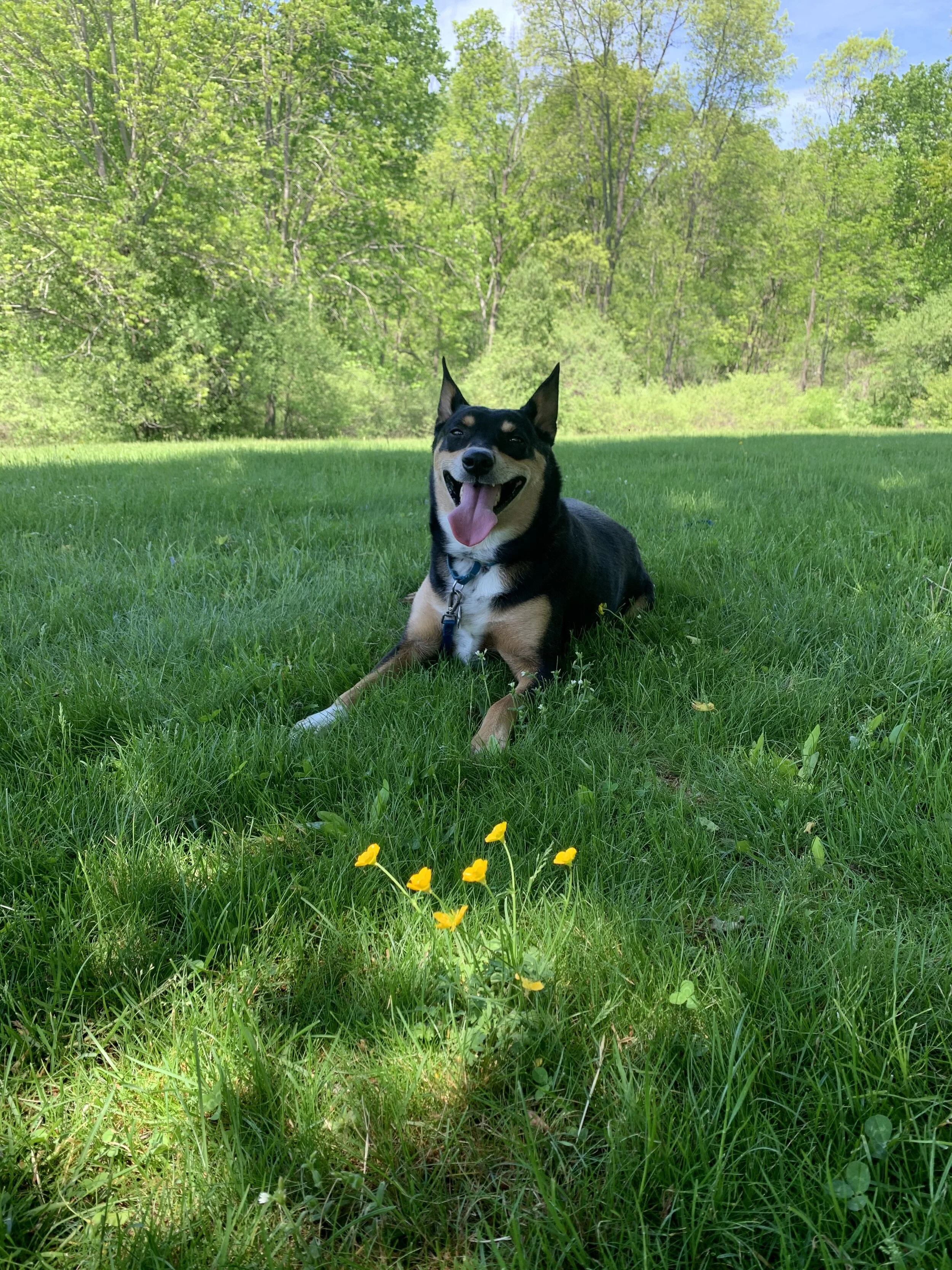 Sarah lives near Prospect Park in Brooklyn with her husband, Andy, and her dog, Ebbet (seen here with some buttercups).